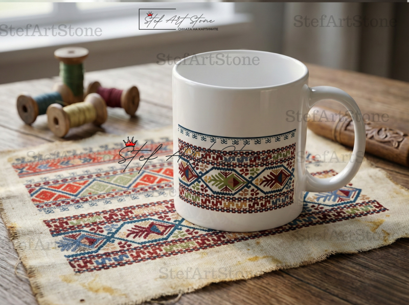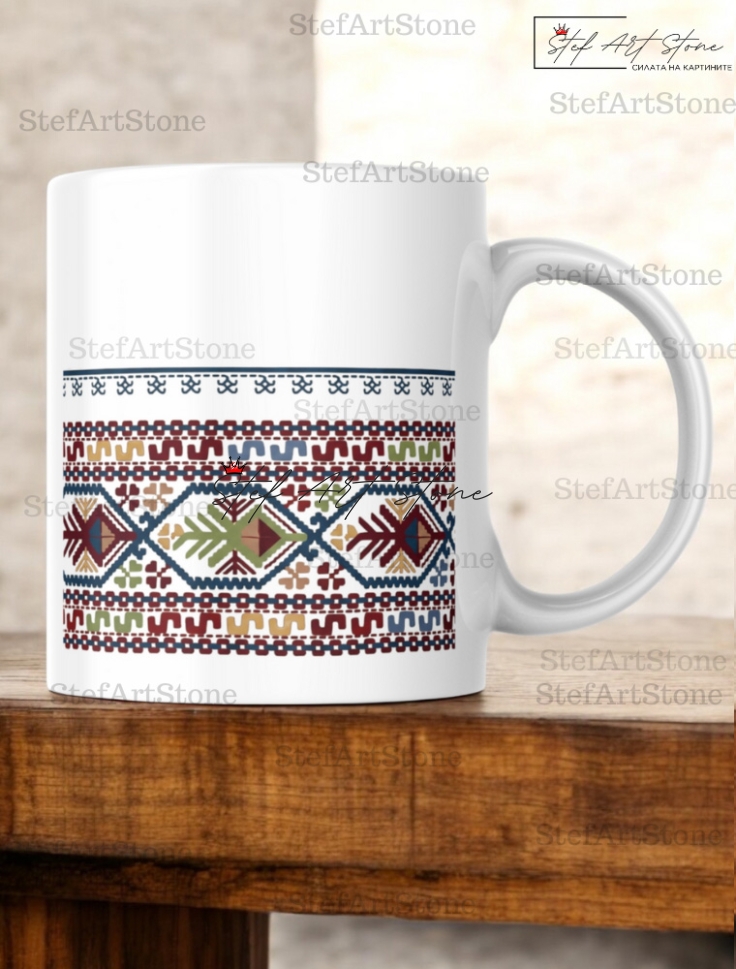 Пренесохме тази вековна "царска" шевица върху керамиката, запазвайки всеки детайл от автентичната схема. Тази чаша е подарък за дама, която носи достойнство и мъдрост.