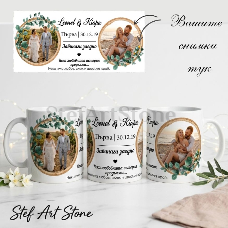 • Тип продукт: Висококачествена керамична чаша за сублимационен печат. • Вместимост: Стандартна 330 мл. • Материал: Бяла керамика. • Дизайн: Модерен ботанически стил с кръгли дървесни рамки и листа от евкалипт. • Персонализация: Вграждане на 2 снимки, добавяне на имена, дата и личен текст. • Опаковка: Включена подаръчна кутия.