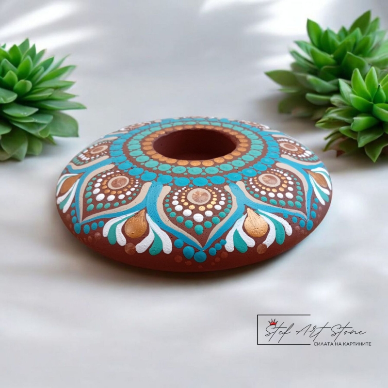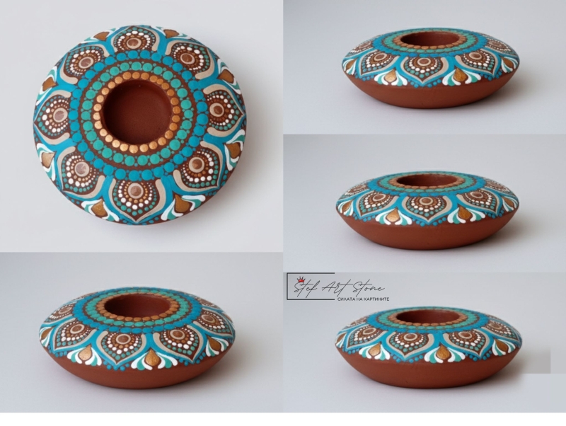 Търсите ли специален аксесоар, който да носи красота, уют и положителна енергия? Представяме Ви най-новия модел – РЪЧНО РИСУВАН СВЕЩНИК МАНДАЛА! Изработен от висококачествен лят камък с диаметър $14$ см, този КЕРАМИЧЕН СВЕЩНИК е не просто предмет, а произведение на изкуството. Всяка точка и линия е нанесена ръчно, създавайки хипнотизиращ МАНДАЛА СВЕЩНИК дизайн в успокояващи тонове на тюркоаз, синьо и златно.