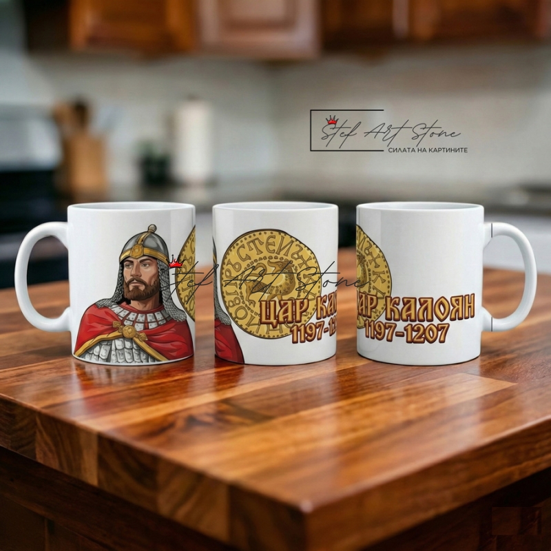 Керамична чаша с портрет на Цар Калоян и изображение на прочутия Калоянов пръстен (печат). Дизайнът включва годините на царуване (1197-1207). Патриотичен подарък за всеки българин. Пристига в кутия.