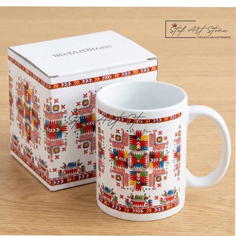 Днес този древен знак оживява върху висококачествена керамична чаша, създадена за хора, които търсят смислен етно подарък, а не масов продукт без история.
