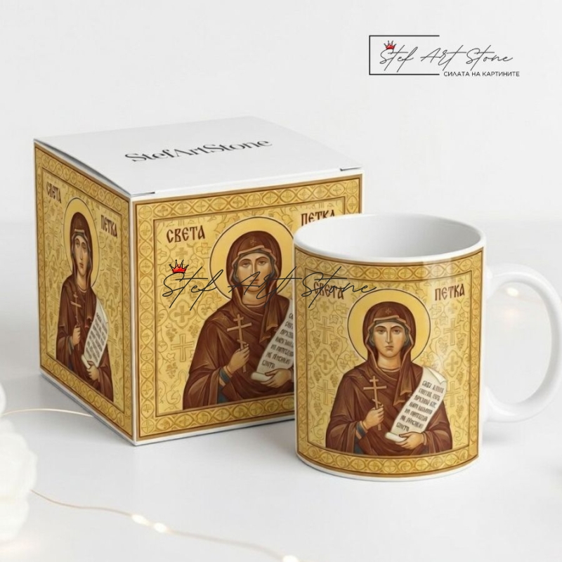- Завършен търговски вид: Най-голямото предимство за вас е, че получавате напълно готов подарък. Тази чаша пристига в луксозна кутия, върху която са отпечатани същите стилни религиозни мотиви и надпис "Света Петка". Не губите време и усилия за допълнително опаковане!