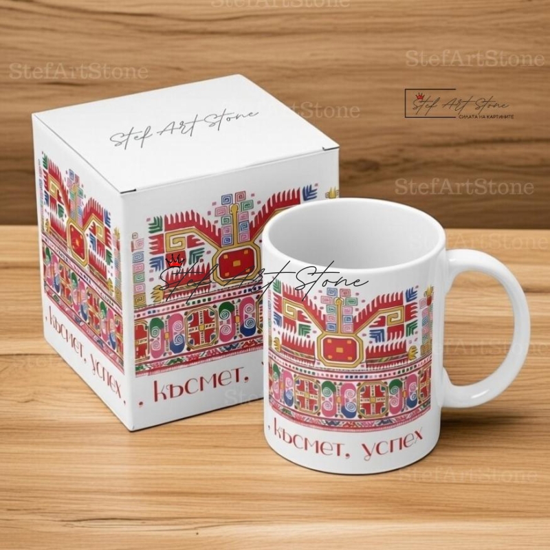 Тази керамична чаша с българска шевица съчетава силата на вековните традиции с модерно пожелание за просперитет. Моделът изобразява една от най-силните български автентични шевици – "Богинята Майка", стилизирана в ярки цветове, за да носи позитивна енергия.