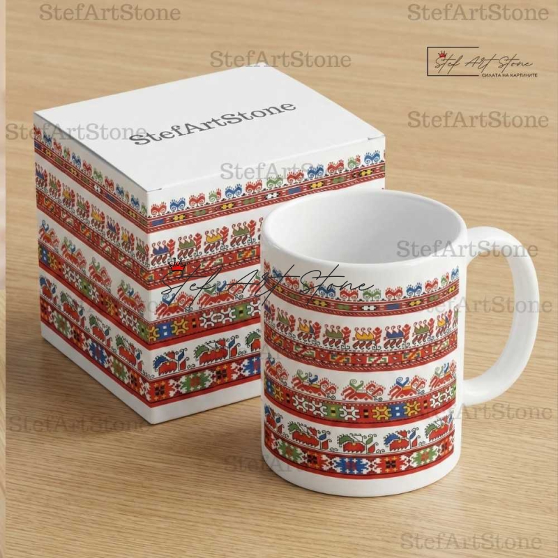 Всяка чаша от серия "Възраждане" пристига при вас в красива тематична кутия, която повтаря мотива на самата шевица. Не е нужно да мислите за допълнителна опаковка – получавате напълно завършен и стилен подарък, готов за връчване веднага!