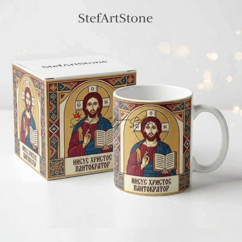 - Завършен търговски вид: Дизайнът се отличава със своите красиви стилизирани мотиви и геометрични орнаменти, които придават изключителна тежест на продукта. Огромното предимство е, че чашата пристига в луксозна кутия, върху която е отпечатан същият въздействащ дизайн с надпис "Исус Христос Пантократор". Получавате напълно готов подарък, без нужда от допълнително опаковане!