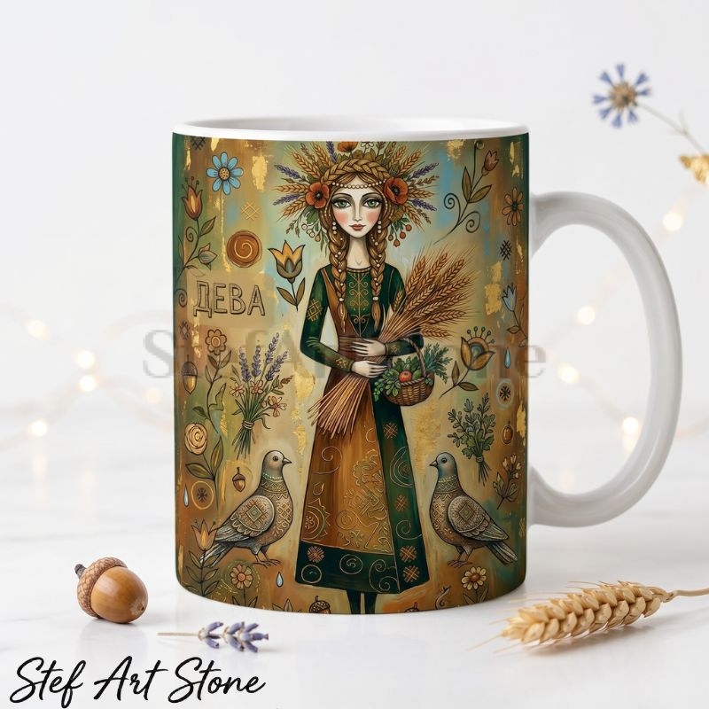 • Тип продукт: Висококачествена керамична чаша за зодия. • Вместимост: Стандартна 330 мл. • Материал: Бяла керамика отвътре, плътен цветен печат отвън. • Дизайн: Художествена илюстрация на богиня Дева с венец от жито, класове, кошница и гълъби в земна зелено-кафяво-златна фолклорна палитра. • Опаковка: Включена подаръчна кутия.