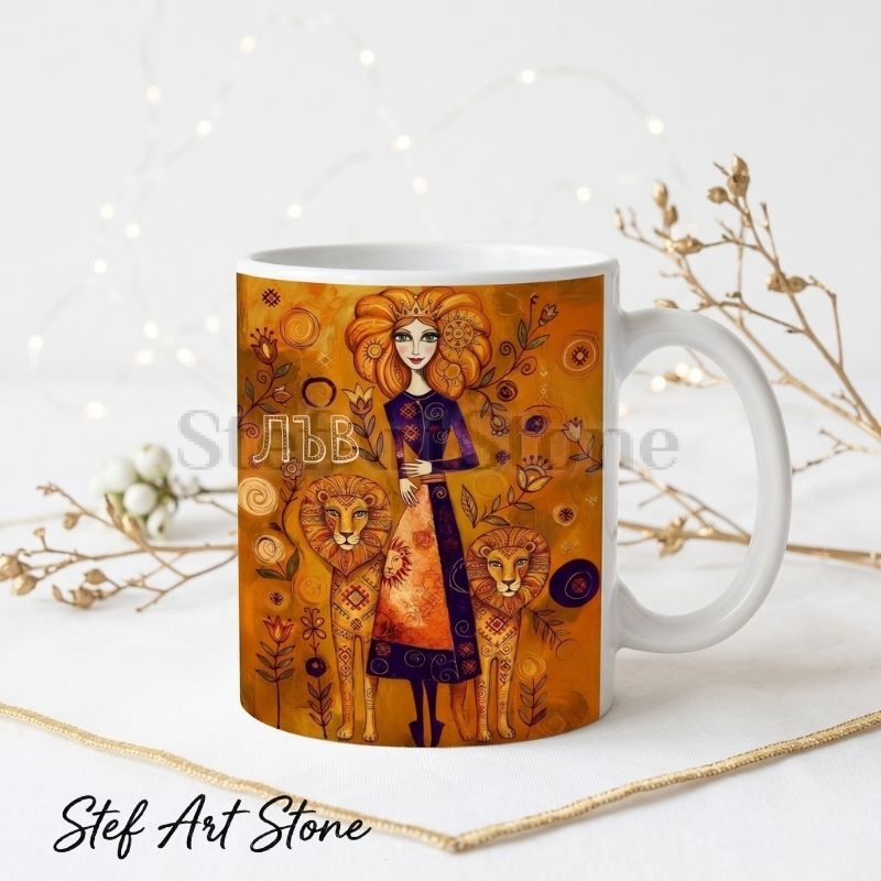 Жената Лъв не влиза в стаята – тя прави вход. С корона на главата и два лъва до краката си, богинята от тази художествена чаша зодия Лъв е точния визуален израз на огнения знак. Дизайнът от серия „Богини на Зодиака" изобразява царска фигура в тъмнолилава народна носия с фолклорни орнаменти, с разкошна рижа коса и корона с флорални мотиви. Двата лъва са украсени с народни шарки, а целият фон пулсира в наситено слънчево злато с цветя, спирали и декоративни акценти. Тази чаша не е просто съд за кафе – тя е ежедневно напомняне за царствената природа на своята притежателка.