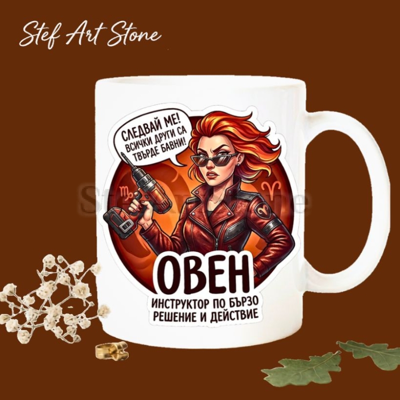 Всяка зодия има своя уникален характер, но огнената природа на Овена е абсолютно ненадмината. Тази чаша зодия Овен е създадена, за да отразява точно тази непримирима енергия и динамика. Със своя смел дизайн и послание "Инструктор по бързо решение и действие", тя е много повече от съд за любимата напитка – тя е ежедневно напомняне за силата, решителността и лидерските качества на своята притежателка.
