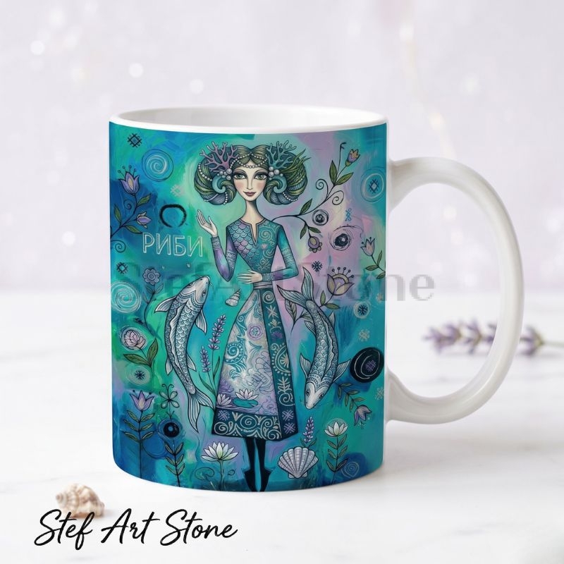 Жените Риби живеят на границата между реалния свят и света на мечтите. Тази художествена чаша зодия Риби от серия „Богини на Зодиака" е визуален сън – нежен, дълбок и изпълнен с морска магия. Илюстрацията изобразява богиня с пищна прическа, украсена с корона от розови корали и перли. Роклята й е изписана с люспи и морски орнаменти в тюркоазено и лилаво. Едната ръка е вдигната – жест на призоваване или благославяне. От двете й страни две изящни риби с народни шарки се плъзгат в морски цветя, миди, кокиче и лавандула. Фонът е мека смес от тюркоазено, зелено и лилаво – атмосферата на дълбоководен сън, в която само Рибите се чувстват като вкъщи.
