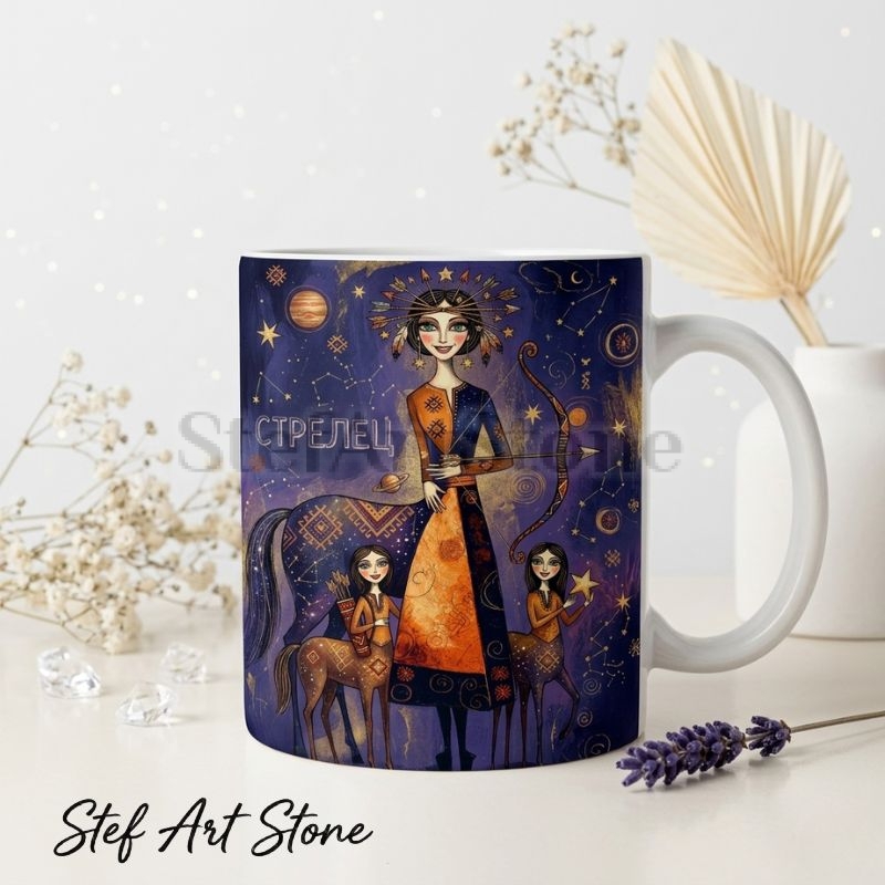 🏹 Богинята Ловец: Художествена керамична чаша зодия Стрелец с величествена богиня с корона от звезди, лък в ръка и две малки кентаврети до нея – портрет на знака, роден да открива нови хоризонти. 🌌 Нощ от съзвездия: Дълбоко синьо и лилаво с Юпитер, Сатурн, съзвездия и народни орнаменти – космическата стихия на огнения знак, преобразена в художествена илюстрация. ✨ Серия „Богини на Зодиака": Художествена колекция на StefArt Stone – уникален дизайн за всяка зодия, какъвто не се среща в масовите магазини. 🎁 Готова за подарък: Пристига в красива кутия – завършена изненада за рожден ден, имен ден или преди ново приключение.