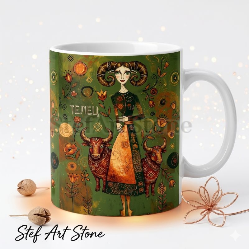 • Тип продукт: Висококачествена керамична чаша за зодия. • Вместимост: Стандартна 330 мл. • Материал: Бяла керамика отвътре, плътен цветен печат отвън. • Дизайн: Авторска фолклорна илюстрация на жена Телец с бикове и флорални елементи на зелен фон. • Опаковка: Включена подаръчна кутия.