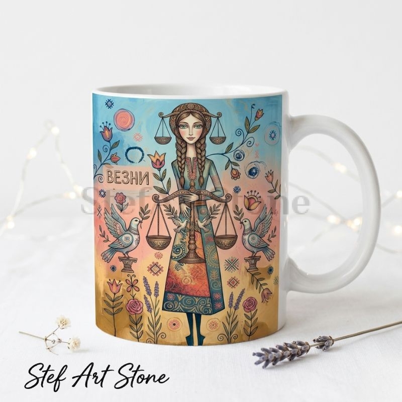 Жената Везни е красотата в действие – изящна, дипломатична, вечно търсеща онзи перфектен баланс между сърцето и разума. Тази художествена чаша зодия Везни от серия „Богини на Зодиака" е визуална поема за нейната природа. Илюстрацията изобразява богиня в народна носия с типично везнянски орнаменти, която с достойнство държи везните – символа на знака. От двете й страни летят бели гълъби, символизиращи хармонията, а около нея цъфтят диви рози и лавандула. Фонът преминава от небесносиньо в топло праскова и злато – всеки цвят с послание.