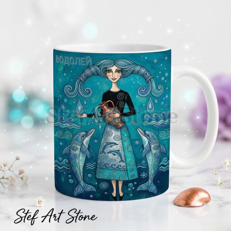 • Тип продукт: Висококачествена керамична чаша за зодия. • Вместимост: Стандартна 330 мл. • Материал: Бяла керамика отвътре, плътен цветен печат отвън. • Дизайн: Художествена илюстрация на богиня Водолей с амфора, два делфина и морски мотиви в наситена тюркоазено-синя палитра. • Опаковка: Включена подаръчна кутия.