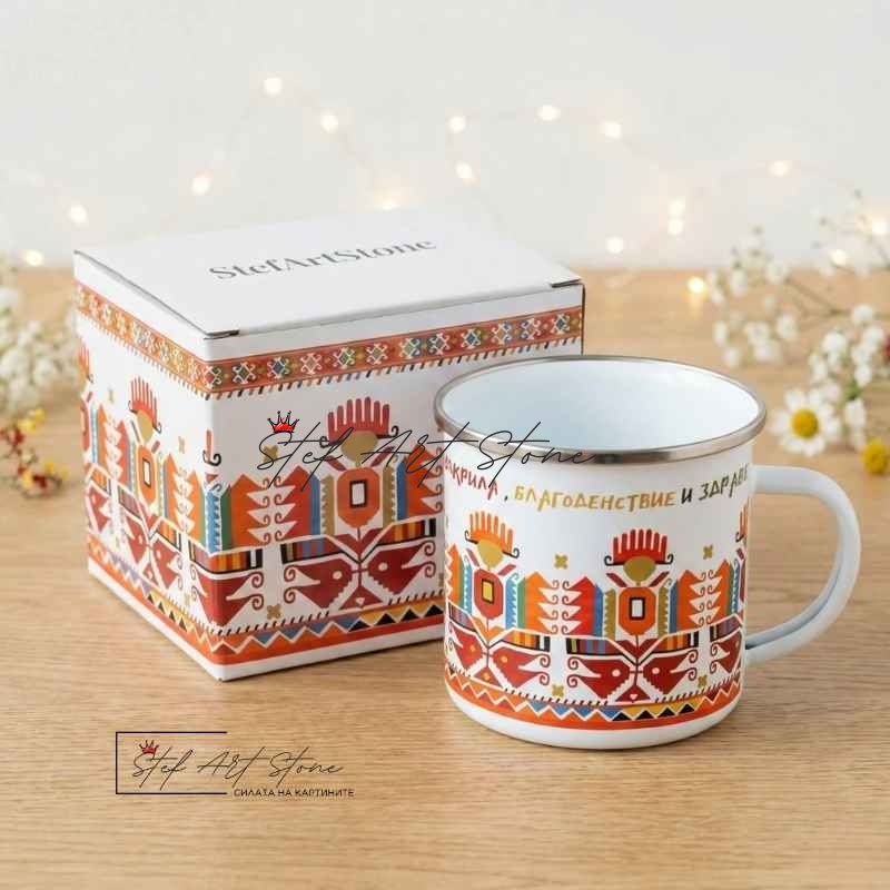 - Завършен Подарък: Канчето идва опаковано в специална картонена кутия, изцяло брандирана с мотивите на шевицата. Няма нужда да търсите опаковка – всичко е готово да зарадва получателя си веднага.