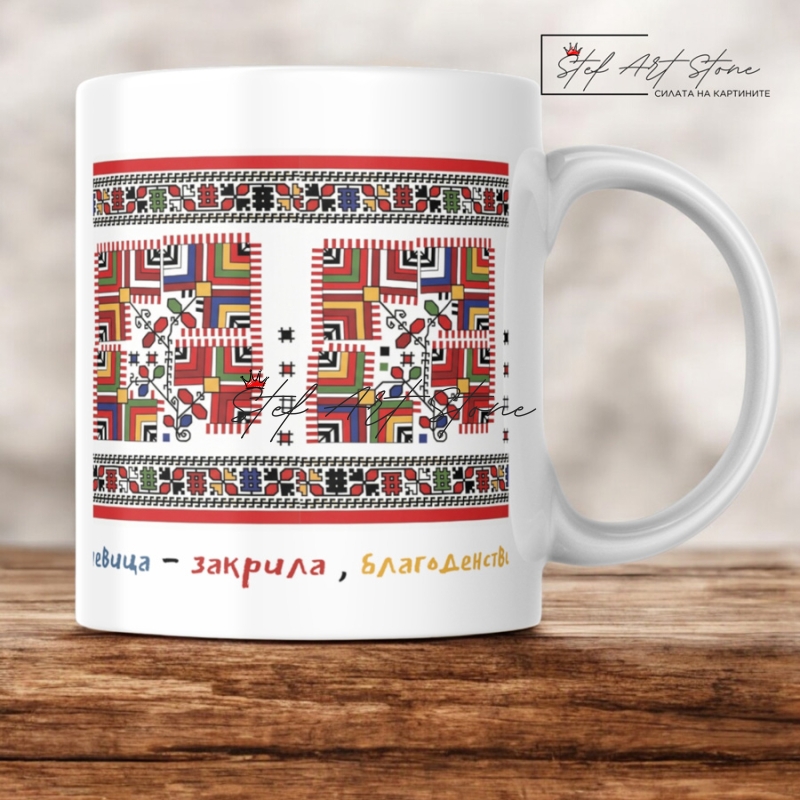 Тази керамична чаша с българска шевица „Розички“ е не просто красив артикул, а рядко фолклорно наследство, пренесено във функционален предмет за всекидневие. Мотивът е от Елин Пелин и е възстановка на шевица, използвана при колани – едно от основните и силно символни носители на традиционната ни бродерия.