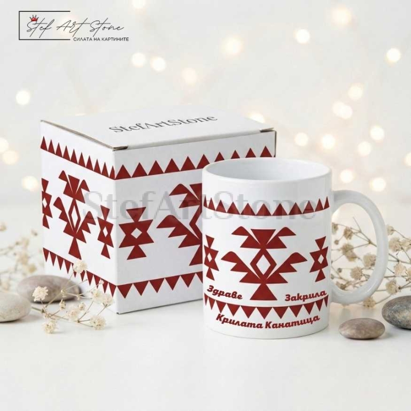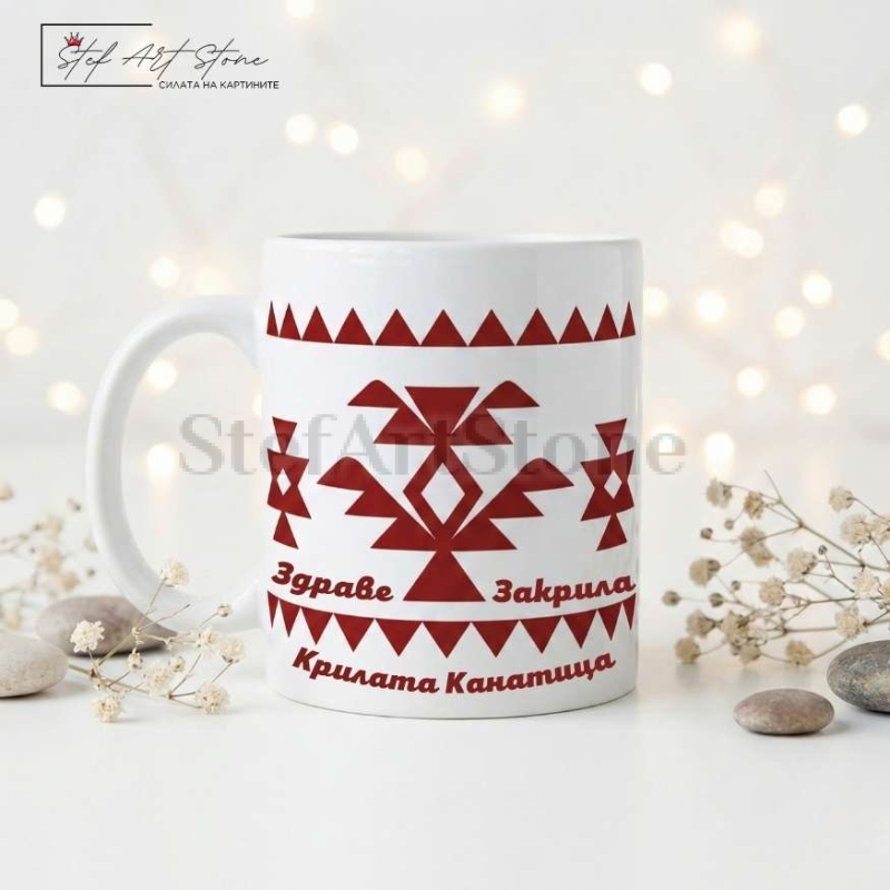 Чаша за Подарък с Български Мотиви Крилата Канатица | Надпис Здраве и Закрила
