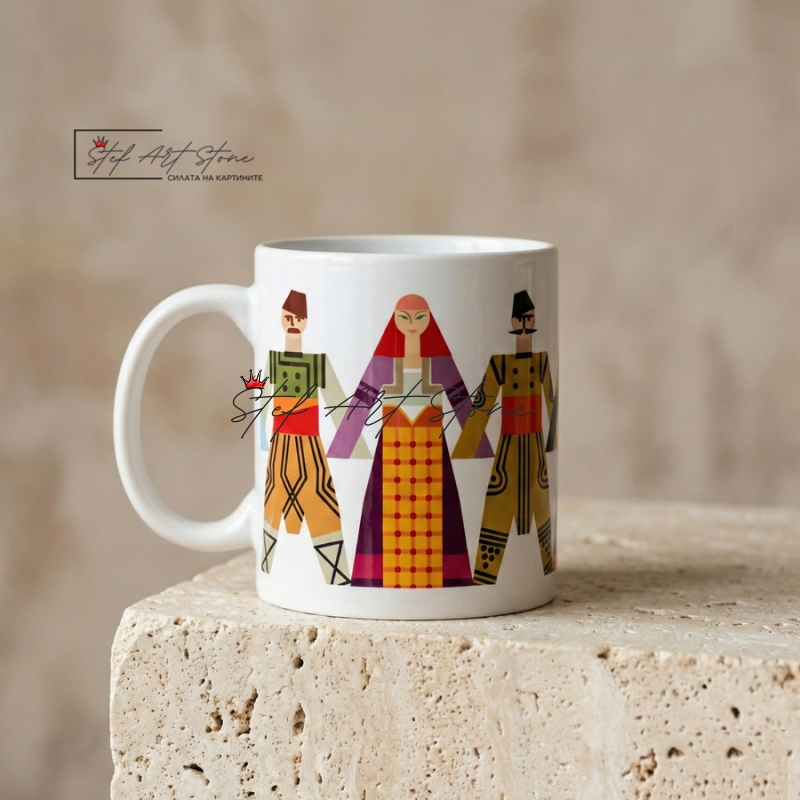 - Традиция и Цвят: Дизайнът изобразява пъстро хоро, което веднага привлича погледа. За разлика от стандартните сувенири, тук българските мотиви са представени в ярки, жизнерадостни цветове.