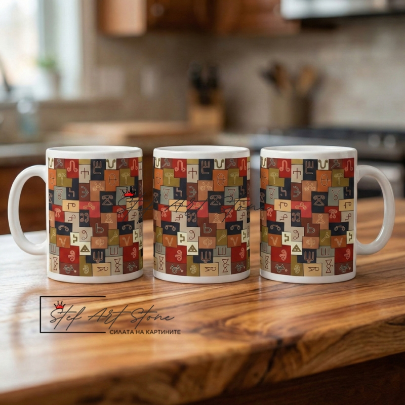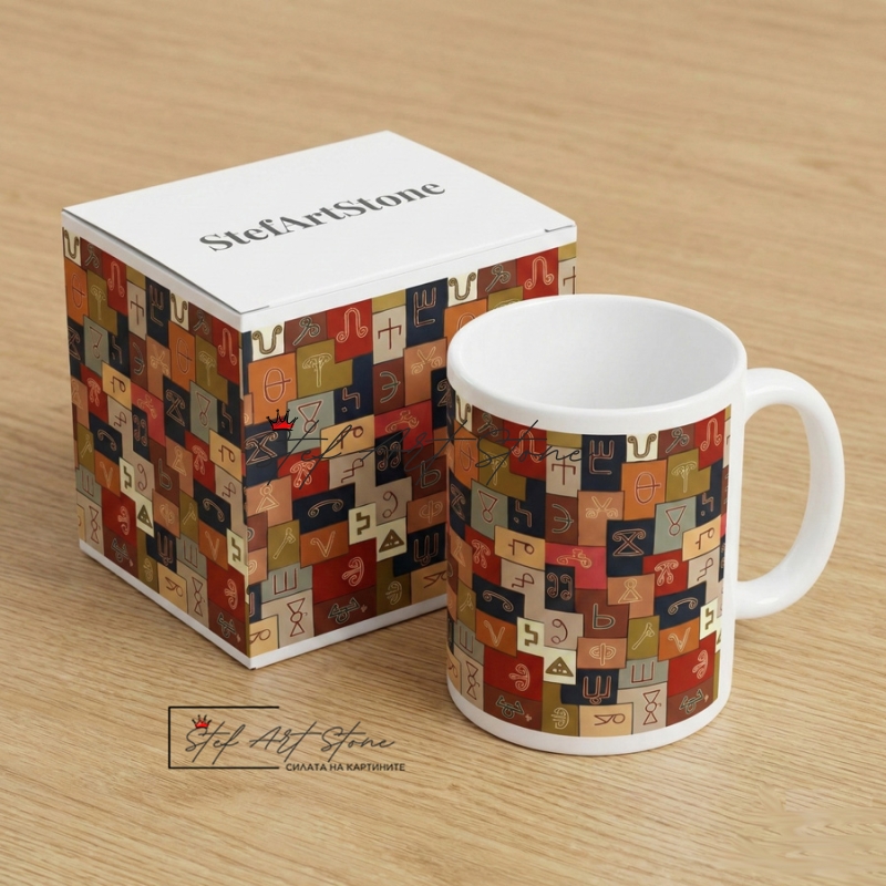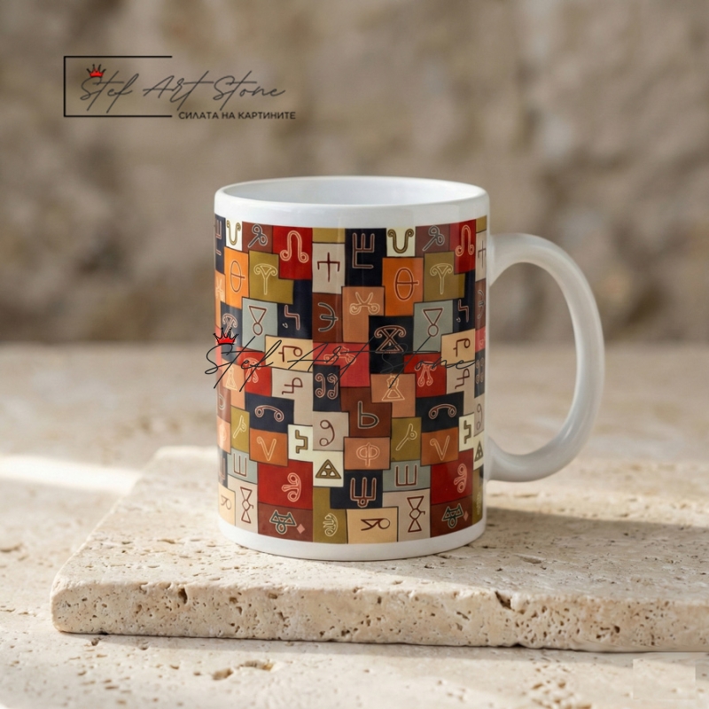Тази керамична чаша е уникално предложение в нашия каталог, защото дизайнът ѝ не е просто компютърна графика, а е базиран на реална авторска картина – "Свещената Глаголица". Тя пренася текстурата и духа на платното върху практичен съд за ежедневието.