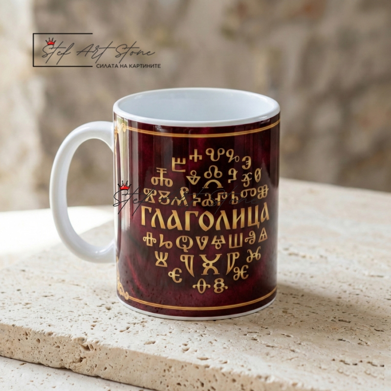 - Кръгова Композиция: В центъра на чашата буквите от глаголицата са подредени в красив кръг (като слънце), а в средата е изписано името на азбуката.
