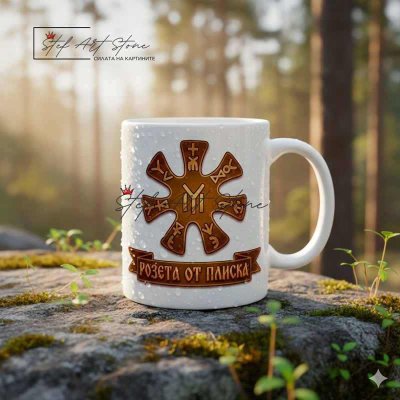 - Дизайн с Лента: Надписът "РОЗЕТА ОТ ПЛИСКА" е разположен елегантно върху стилизирана бронзова лента (банер) под символа, придавайки завършен и автентичен вид.