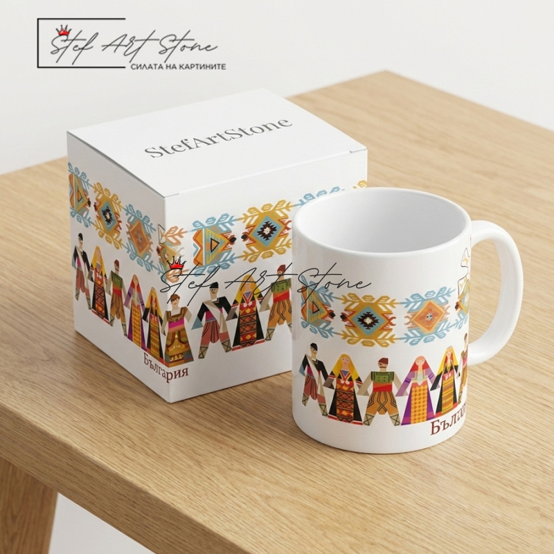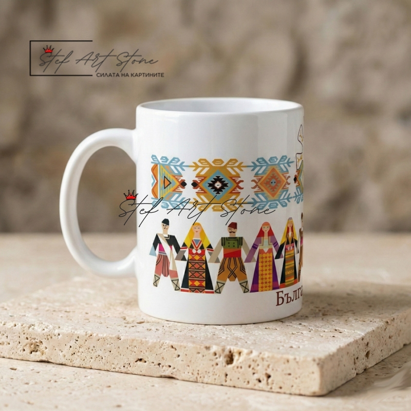 - Богата декорация: Дизайнът включва пъстро хоро с мъже и жени в носии, а в горния край е добавен красив, плътен бордюр от цветни български мотиви (шевици). Тази комбинация прави чашата да изглежда завършена и празнична.