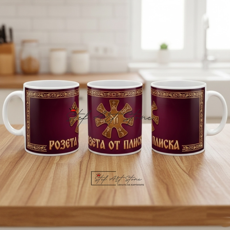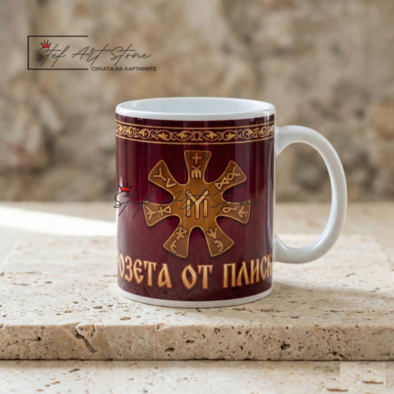 Ако търсите подаръци чаши със силно историческо послание, този модел е без аналог. Той е посветен на един от най-ценните артефакти от Първото българско царство – бронзовата седемлъчева розета, открита в Плиска.