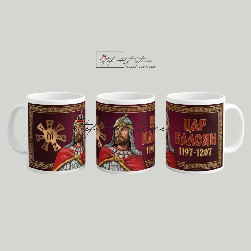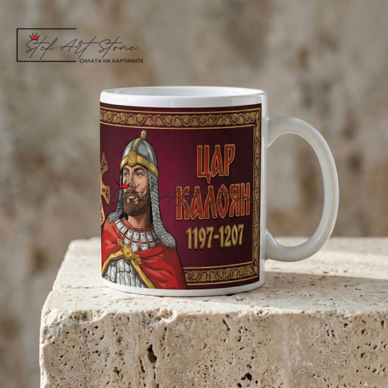Подарък за мъж с българска символика. Авторска чаша с образа на цар Калоян и Розетата от Плиска – патриотичен и смислен избор за българи у нас и в чужбина.