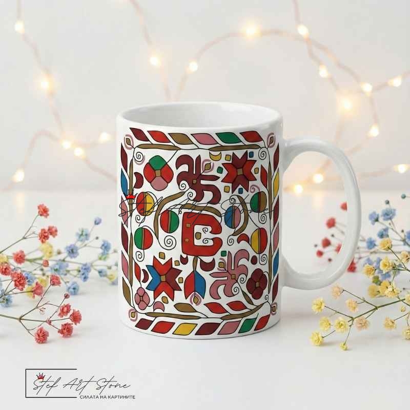 Висококачествена бяла керамична чаша (330 мл), носеща духа на България. Дизайнът е богата, многоцветна шевица с геометрични и флорални елементи, символизиращи хармония и плодородие.