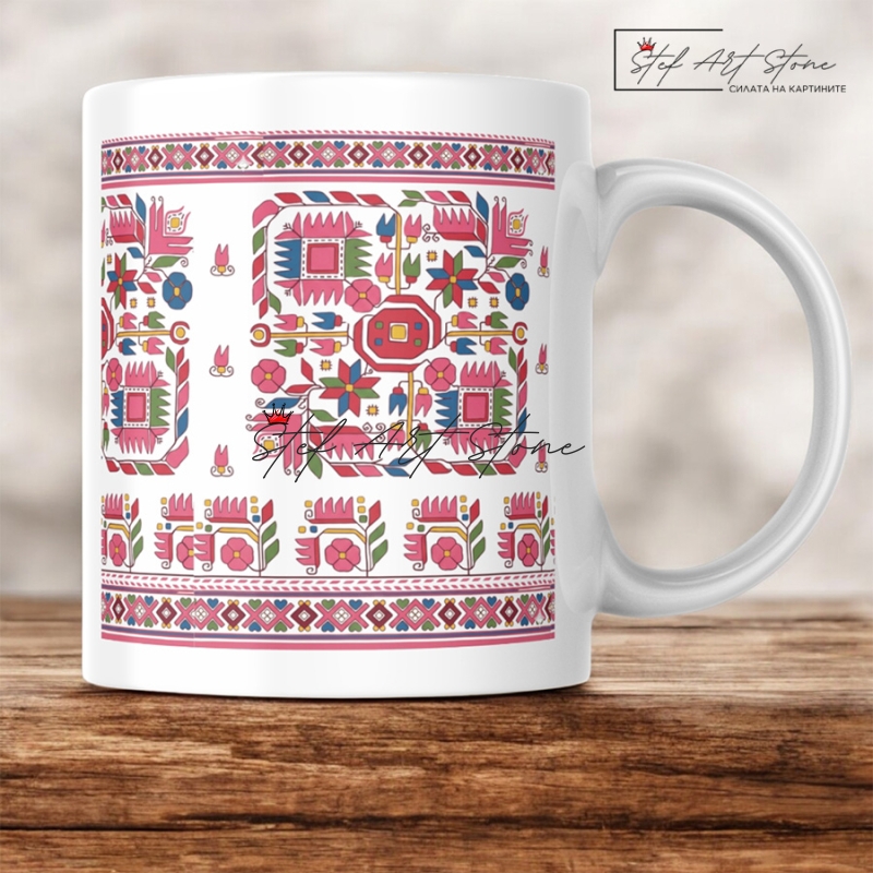 Тази керамична чаша с българска шевица представя по-меката и романтична страна на фолклора от Дупнишкия край. За разлика от строгите геометрични форми, тук български автентични шевици "разцъфват" в нежни розови и сини нюанси, носейки усещане за женственост и хармония.