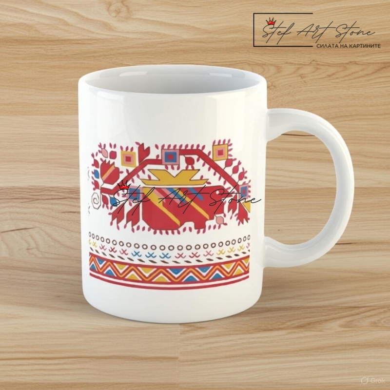 Тази керамична чаша с българска шевица е носител на гордия дух на Югозапада. Моделът представя класически елемент от кюстендилската везба, която се слави със своята плътност, сложна геометрия и жизнерадостни цветове.
