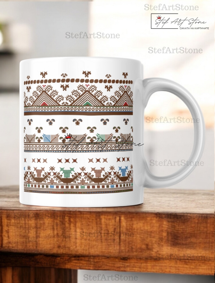 Тази керамична чаша с шевица пренася красотата на Плевенския край в ежедневието ви. Дизайнът е вдъхновен от везбите по ръкавите на старинните ризи, където всеки бод е подреден с математическа точност и мисъл за плодородие.