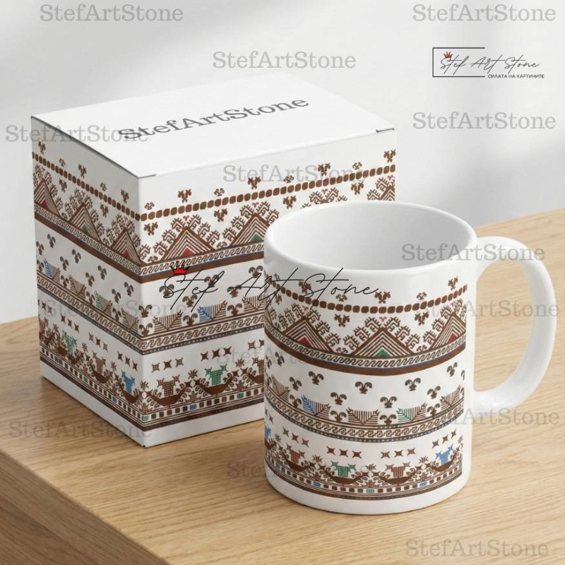 Всяка чаша от серия "Възраждане" пристига при вас в красива тематична кутия, която повтаря мотива на самата шевица. Не е нужно да мислите за допълнителна опаковка – получавате напълно завършен и стилен подарък, готов за връчване веднага!