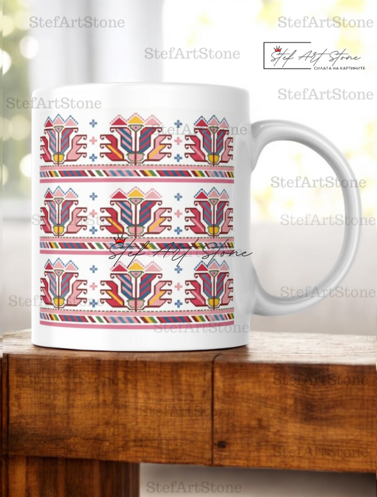 Тази керамична чаша ни показва една по-различна, светла и усмихната страна на Самоковската везба. Вдъхновена от празничните ризи на момите, тя носи усещане за пролет, лекота и цъфтяща младост.
