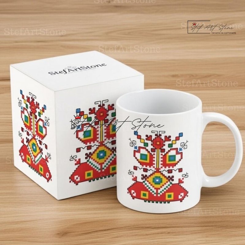 Всяка чаша от серия "Възраждане" пристига при вас в красива тематична кутия, която повтаря мотива на самата шевица. Не е нужно да мислите за допълнителна опаковка – получавате напълно завършен и стилен подарък, готов за връчване веднага!