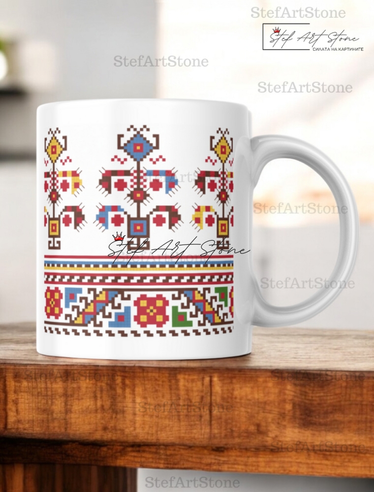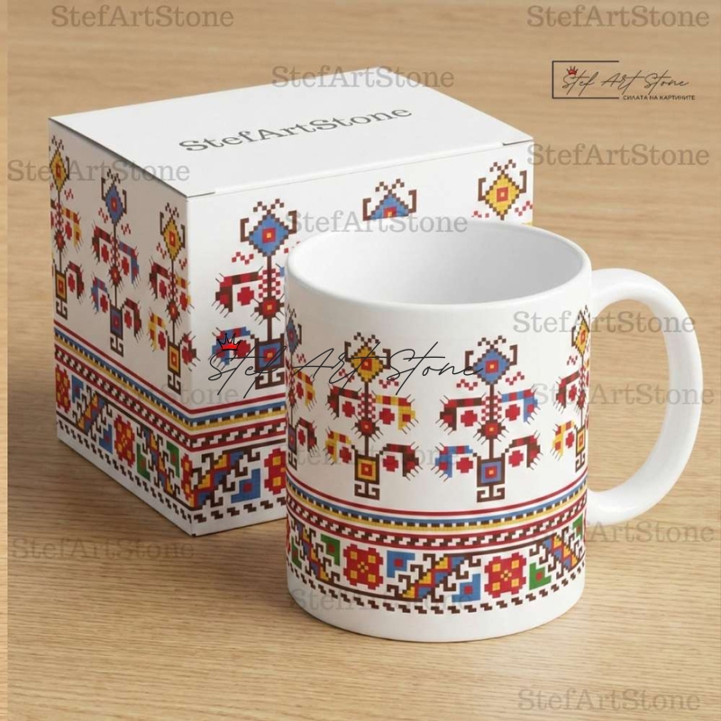 Всяка чаша от серия "Възраждане" пристига при вас в красива тематична кутия, която повтаря мотива на самата шевица. Не е нужно да мислите за допълнителна опаковка – получавате напълно завършен и стилен подарък, готов за връчване веднага!