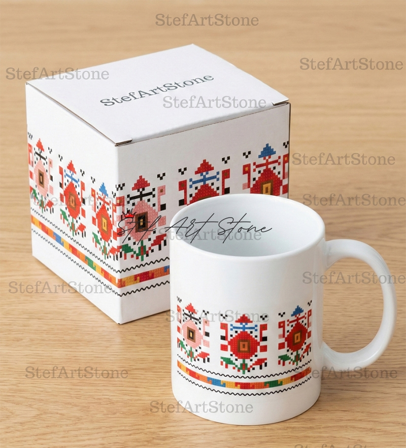 - Традиция в модерен прочит: Структурата тип "кръстат бод" стои автентично, но изчистеният бял фон придава на чашата съвременен вид, който пасва на всеки интериор.