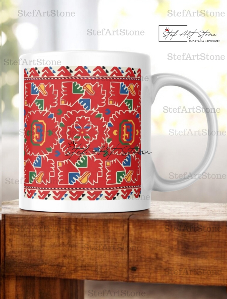 - Силата на червеното: Дизайнът е потопен в наситено червено – цветът, който във фолклора гони злото и символизира кипящия живот. Тази чаша буквално "свети" на масата.