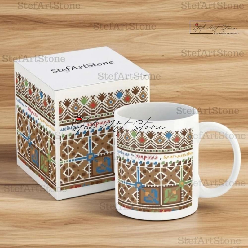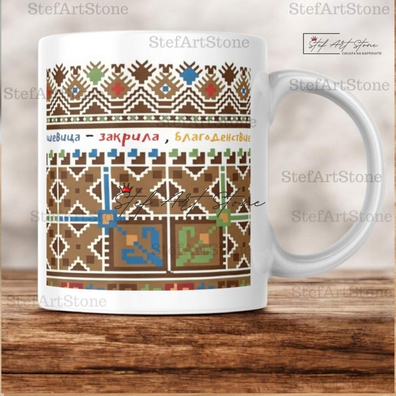 - Наричане за добра съдба: Централно място в дизайна заема надписът "шевица – закрила, благоденствие". Това превръща чашата в мощен подарък-пазител.