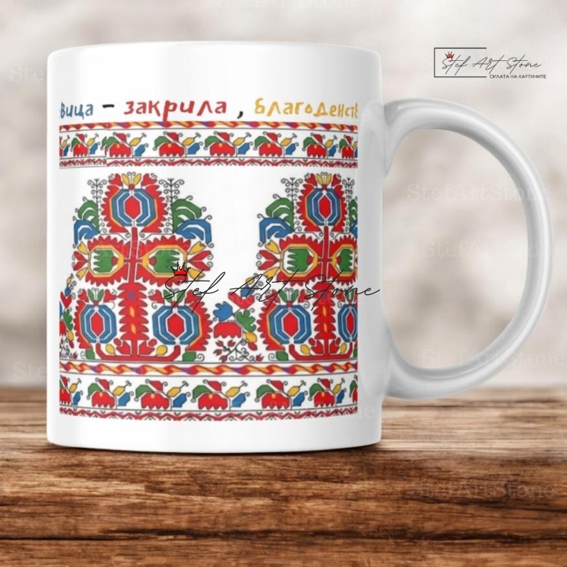 - Думи на силата: В горния ръб на чашата е изписано ясното послание: "шевица — закрила, благоденствие". Това превръща чашата в перфектния подарък-талисман.