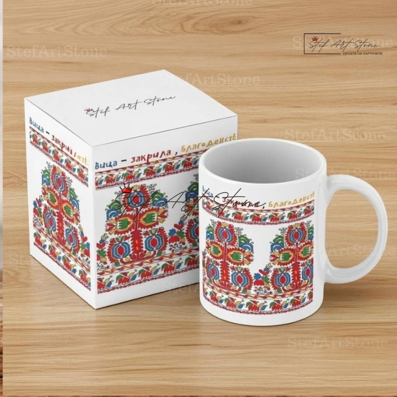 Всяка чаша от серия "Възраждане" пристига при вас в красива тематична кутия, която повтаря мотива на самата шевица. Не е нужно да мислите за допълнителна опаковка – получавате напълно завършен и стилен подарък, готов за връчване веднага!