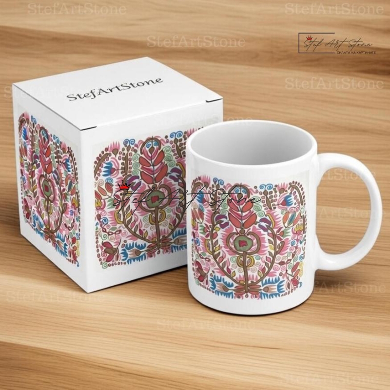 Всяка чаша от серия "Възраждане" пристига при вас в красива тематична кутия, която повтаря мотива на самата шевица. Не е нужно да мислите за допълнителна опаковка – получавате напълно завършен и стилен подарък, готов за връчване веднага!