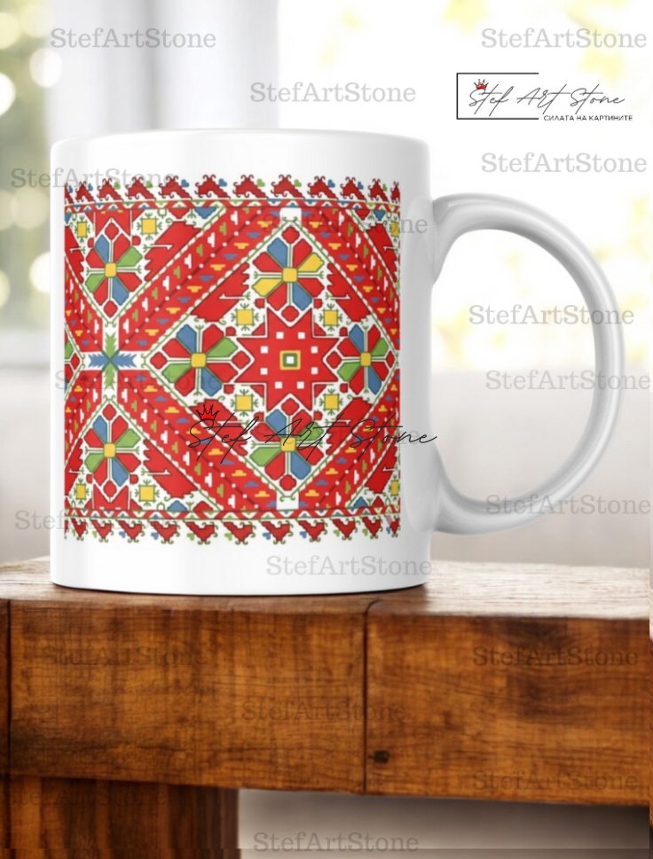 - Силата на червеното: Дизайнът е доминиран от наситено червено – цветът на кръвта, живота и защитата от уроки във фолклора. Това прави чашата изключително забележима и зареждаща.