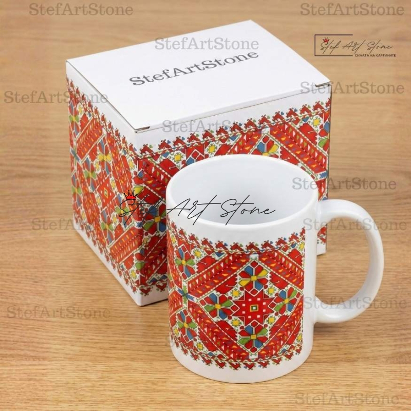 Всяка чаша от серия "Възраждане" пристига при вас в красива тематична кутия, която повтаря мотива на самата шевица. Не е нужно да мислите за допълнителна опаковка – получавате напълно завършен и стилен подарък, готов за връчване веднага!