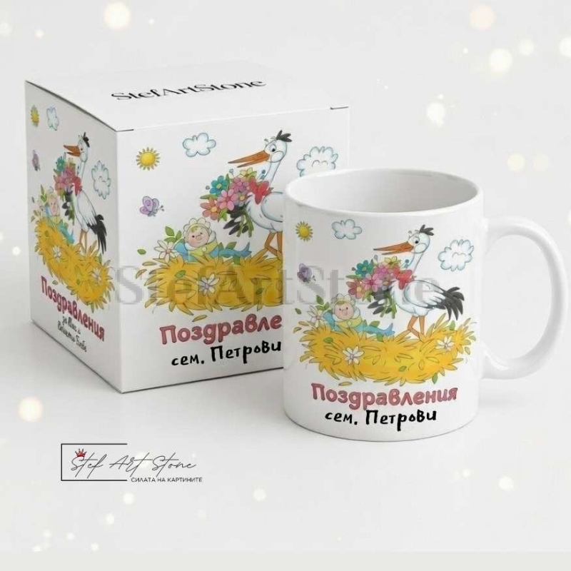 Нашите персонализирани чаши са създадени, за да носят радост. Най-голямото предимство на този модел е възможността да бъде изработен изцяло за вас – като чаша по поръчка, върху която ще отпечатаме фамилията на щастливите родители (напр. "Поздравления сем. Петрови"). Дизайнът е изключително нежен и класически за повода – красива рисунка на щъркел и усмихнато бебе.