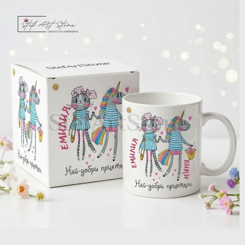 Нашите персонализирани чаши са създадени, за да носят радост и усмивки всеки ден. Най-голямото предимство на този модел е възможността да бъде изработен изцяло за вас – като чаша по поръчка, върху която ще отпечатаме вашите две имена (напр. "Емилия" и "Вики"). Дизайнът е изключително свеж и забавен – красива рисунка на коте и еднорог, допълнена от най-важното послание: "Най-добри приятели".