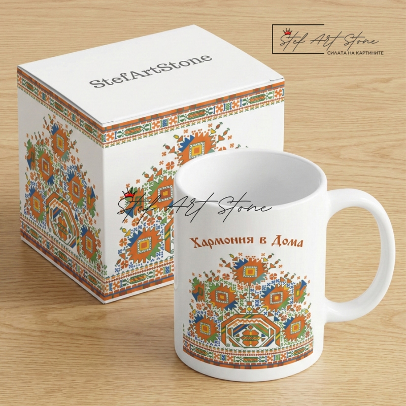 Чаша с Граовска Шевица и Надпис "Хармония в Дома" – Етно Подарък за Семеен Уют