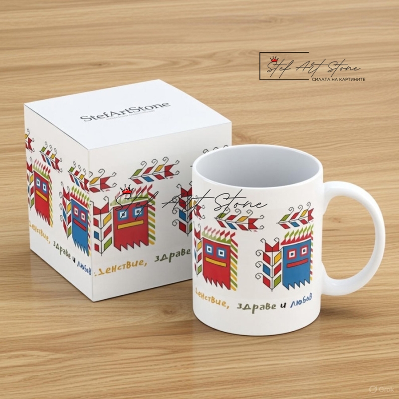 Фигуралният мотив в зелено, червено и синьо е балансиран с ясно изписаното пожелание. Това прави модела подходящ избор за хора, които търсят чаша с надпис, но с дълбок културен контекст. - Послание за благоденствие и хармония в дома