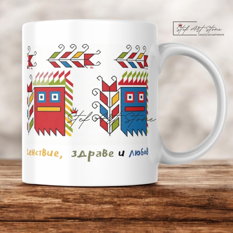 Чаша със Самоковска Шевица „Пазителите“ и Надпис „Здраве и Любов“ – Чаша с Българска Шевица и Пожелание