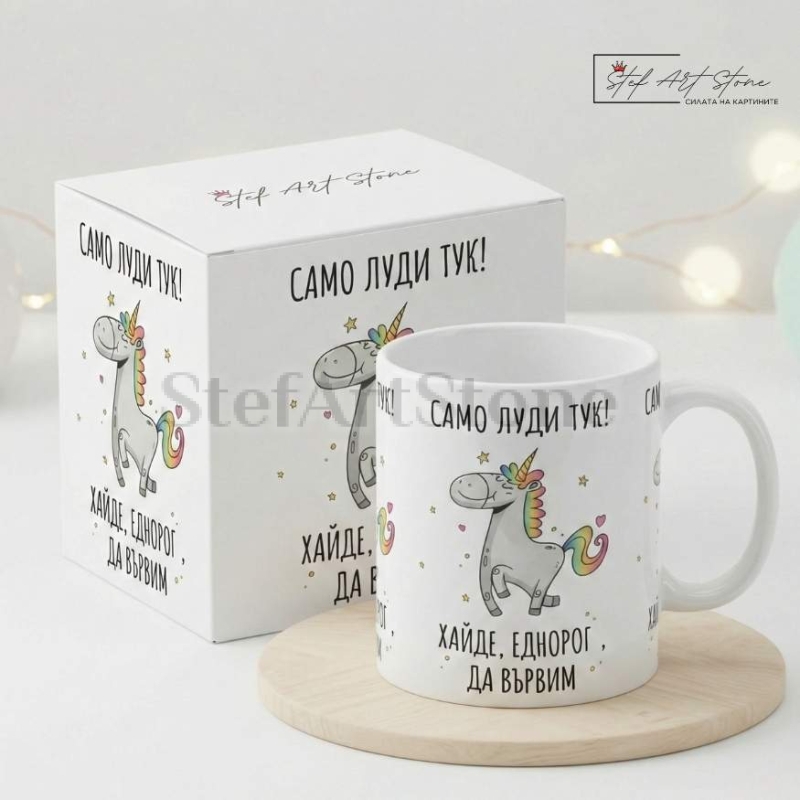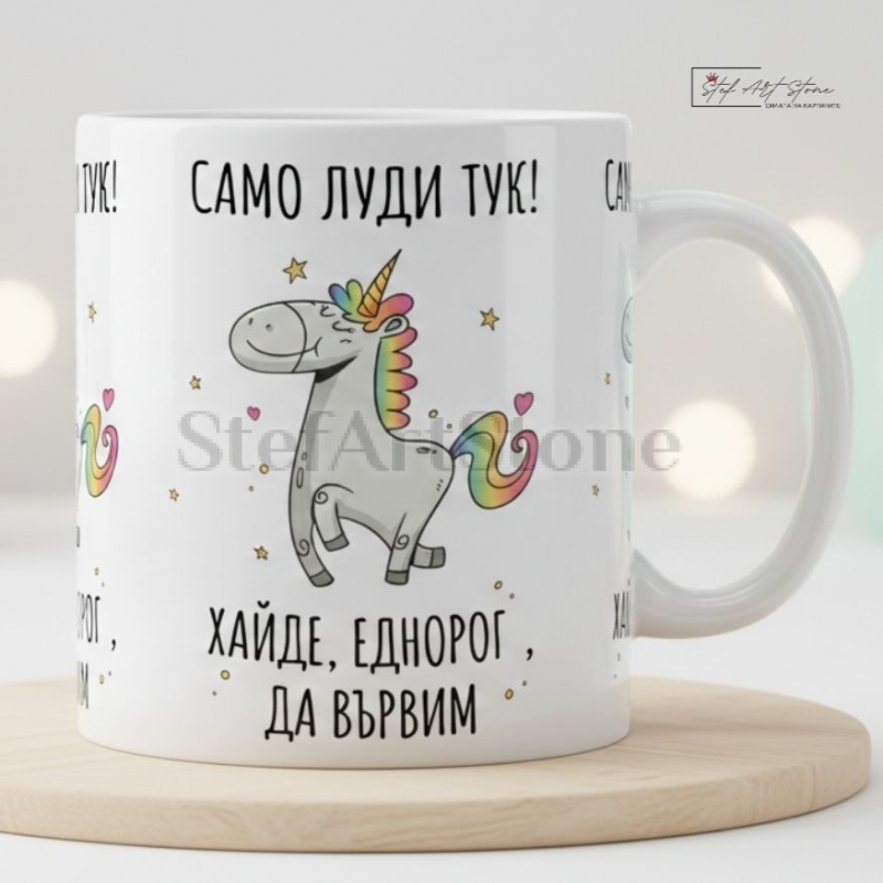 Дизайнът със симпатичния еднорог и култовото послание "САМО ЛУДИ ТУК! ХАЙДЕ, ЕДНОРОГ, ДА ВЪРВИМ" я прави един от най-търсените ни забавни продукти. Нашите предложения са повече от просто вещи за ежедневието – те са истински персонализирани подаръци, които създават незабравими спомени и вътрешни шеги.