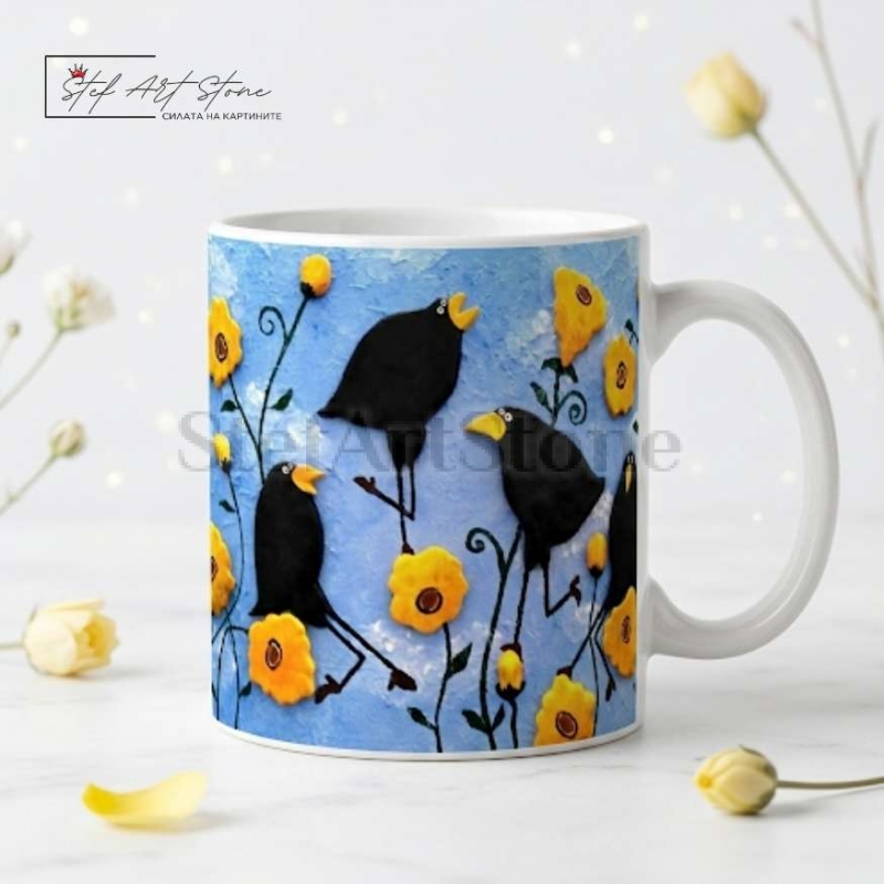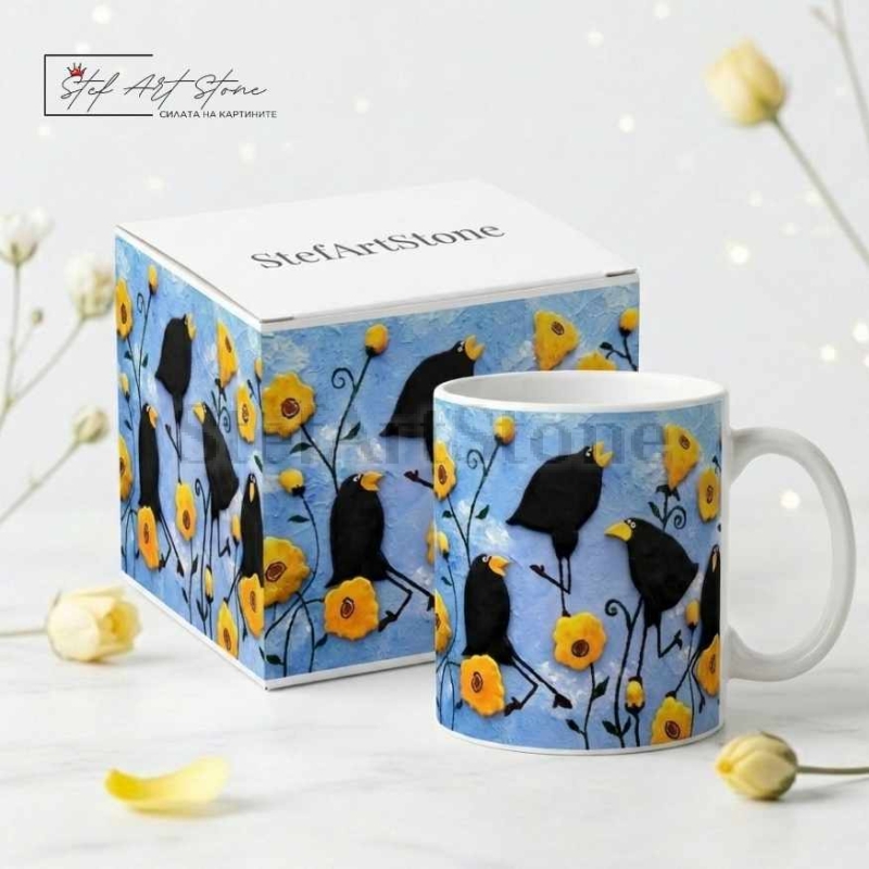 Това не е просто поредната картинка от интернет. Тази чаша за подарък носи духа на истинското изкуство. Илюстрацията върху нея е базирана на оригиналното релефно пано "Веселите врани", създадено изцяло на ръка в нашето ателие. Избирайки този продукт, вие подарявате достъпно авторско изкуство за ежедневието.